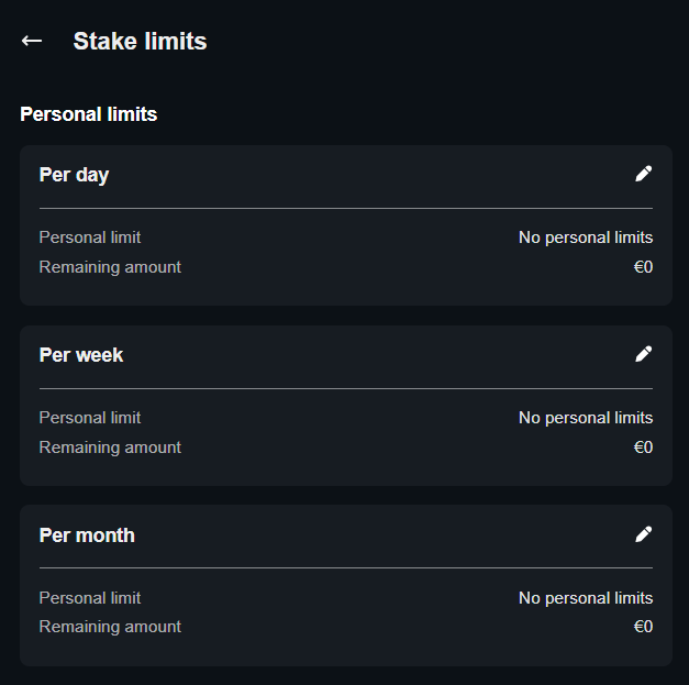 In addition to deposit and loss limits, you can also set stake limits. These limit your spending by setting a maximum amount of stakes for a period of 24 hours, 7 days and 30 days.
