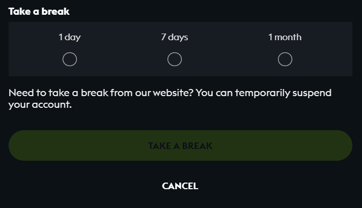Once the break is activated, you can still log in and get access to the withdrawals page for example, but you can no longer play during the defined period. Once the period has ended, all the features will be automatically reactivated on your account and you can play and bet again.