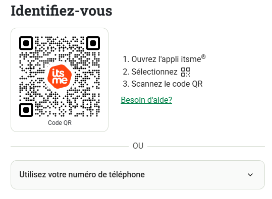 - Scannez le QR Code à l'aide de votre application ItsMe et introduisez ensuite votre code personnel pour valider la connexion.