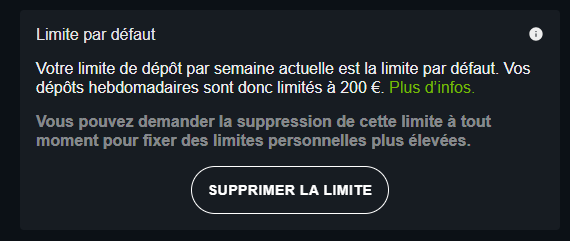 Depuis le 20 octobre 2022, la régulation belge impose une limite de dépôt par défaut de 200 € par semaine. Si vous le souhaitez, vous pouvez demander la désactivation de cette limite par défaut depuis les paramètres de votre compte. Votre demande sera alors transmise à la Commission des jeux de hasard, qui vous fournira une réponse (positive ou négative) dans un délai de 72h ouvrables.