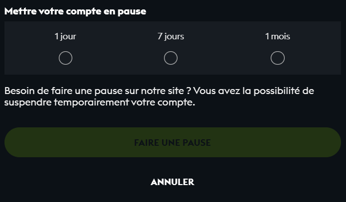 La pause vous permet de bloquer vos accès aux jeux de hasard pour une durée de 1 jour à 1 mois.