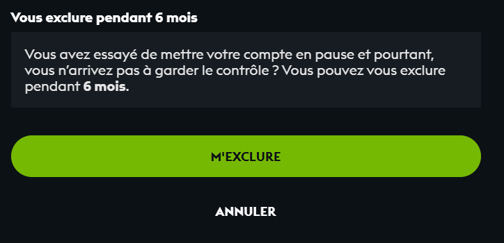 Contrairement à la pause, l'auto-exclusion vous empêche totalement de vous connecter à votre compte. Une fois le délai passé, l'exclusion sera automatiquement levée et vous aurez à nouveau accès à votre compte.
