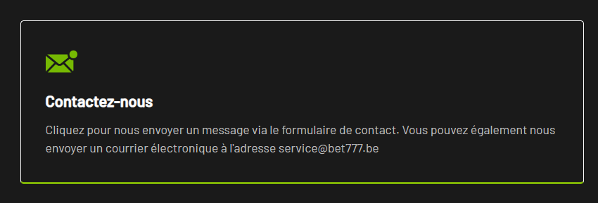Sur Bet777, rendez-vous dans le menu CENTRE D'AIDE situé en haut à droite de l'écran, puis sélectionnez Envoyer-nous un message dans le bas de la page.