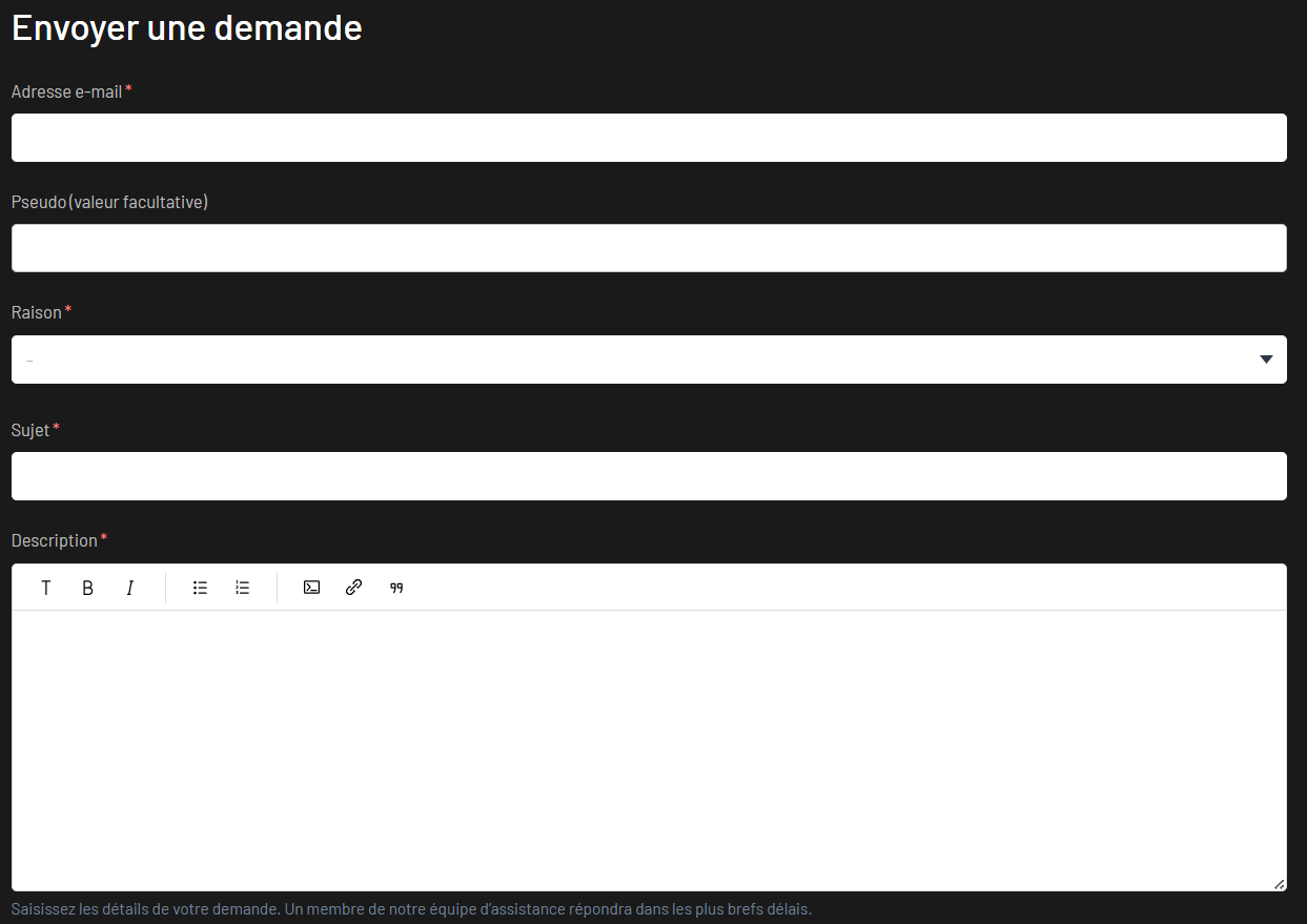 Vous serez alors redirigé vers notre formulaire de contact. Si vous êtes connecté, il vous suffira de sélectionner le sujet dans la liste déroulante et de nous écrire votre question. Si vous n'êtes pas connecté, vous devrez remplir tous les champs manuellement.