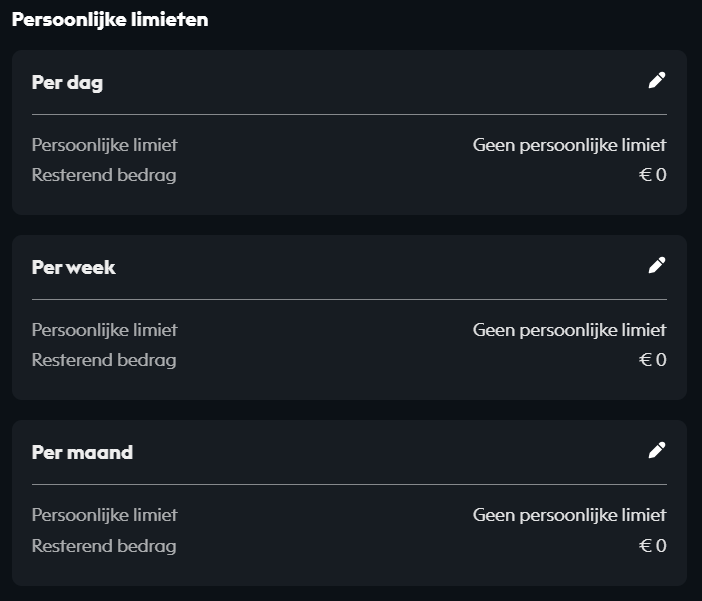 Deze limieten zijn specifiek voor jou, dat wil zeggen dat je het maximale stortingsbedrag zelf instelt in je instellingen. Er zijn 3 soorten persoonlijke limieten: