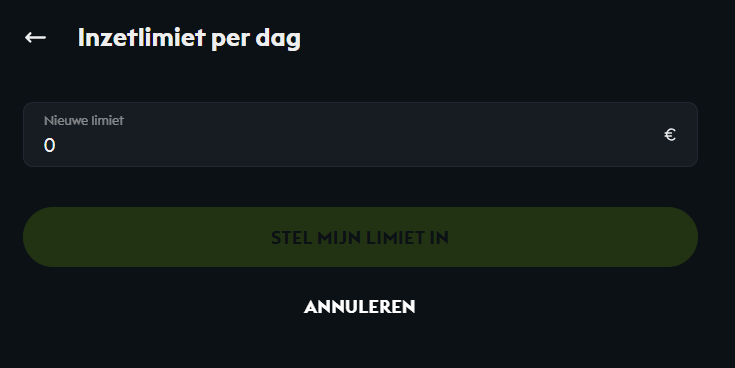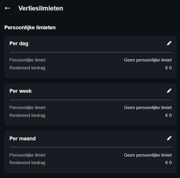 Naast je stortings- en inzetlimieten kun je ook verlieslimieten instellen. Deze limieten bestaan uit het beperken van je verliezen door een maximaal verliesbedrag in te stellen over een periode van 24 uur, 7 dagen en 30 dagen.