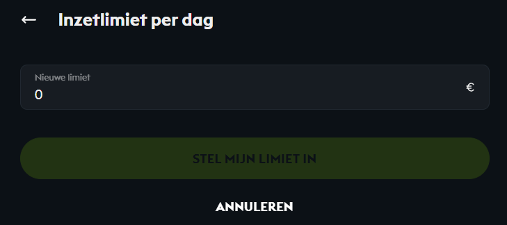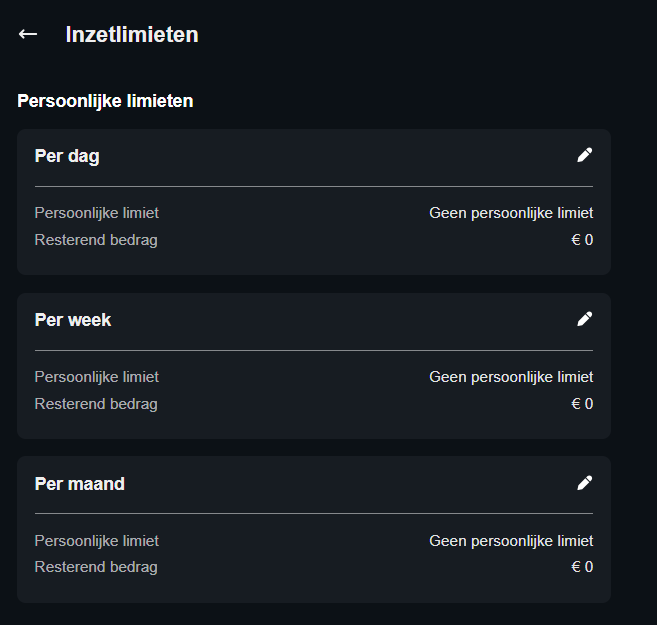 Naast je stortings- en verlieslimieten kun je ook inzetlimieten instellen. Deze limieten bestaan uit het beperken van je uitgaven door een maximaal inzetbedrag in te stellen over een periode van 24 uur, 7 dagen en 30 dagen.