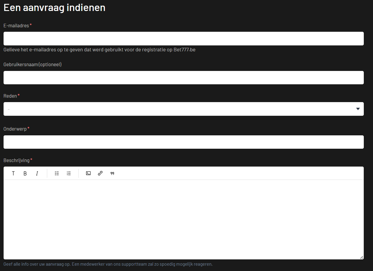Ga op Bet777 naar het menu Helpcentrum rechts bovenaan het scherm en selecteer Stuur ons een bericht in de keuzelijst.